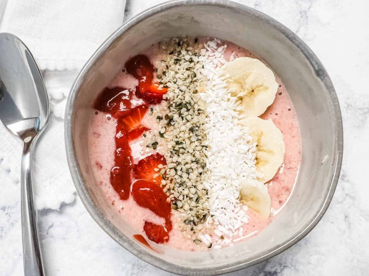 Just blend Greek yogurt, frozen strawberries and banana chunks together, then add healthy toppings like hemp seeds, coconut and more fruit.